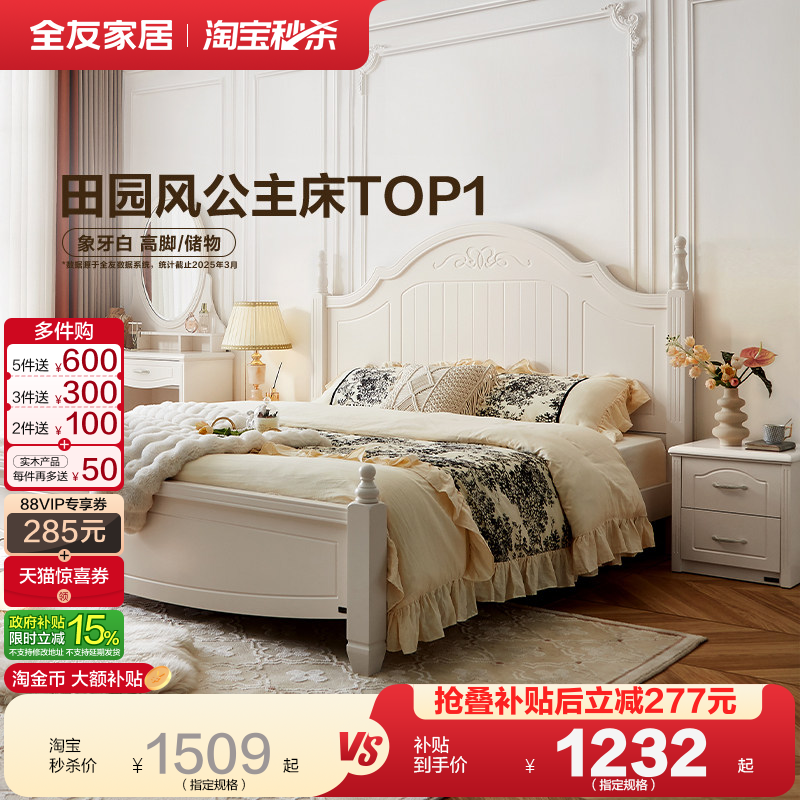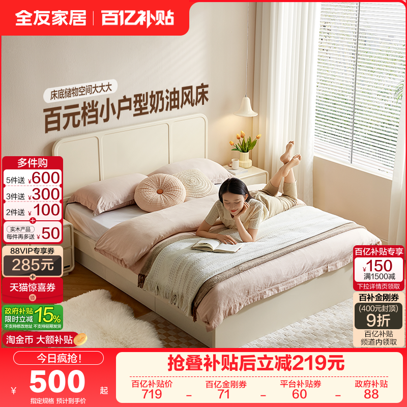 全友家居美式板式床主卧室家具1米8双人储物大床奶油风1米5公主床