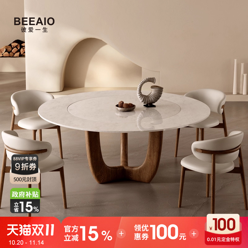 侘寂风天然大理石餐桌圆桌带转盘北欧轻奢家用实木圆形意式吃饭桌