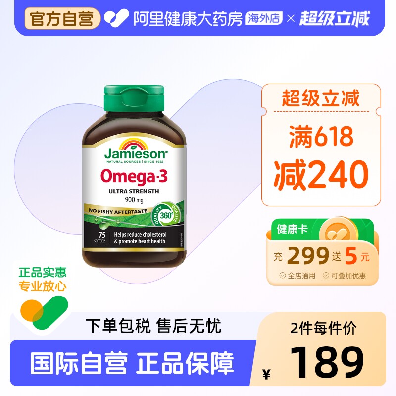 JAMIESON健美生鱼油OMEGA-3软胶囊75粒深海鱼DHA进口保健品高纯度