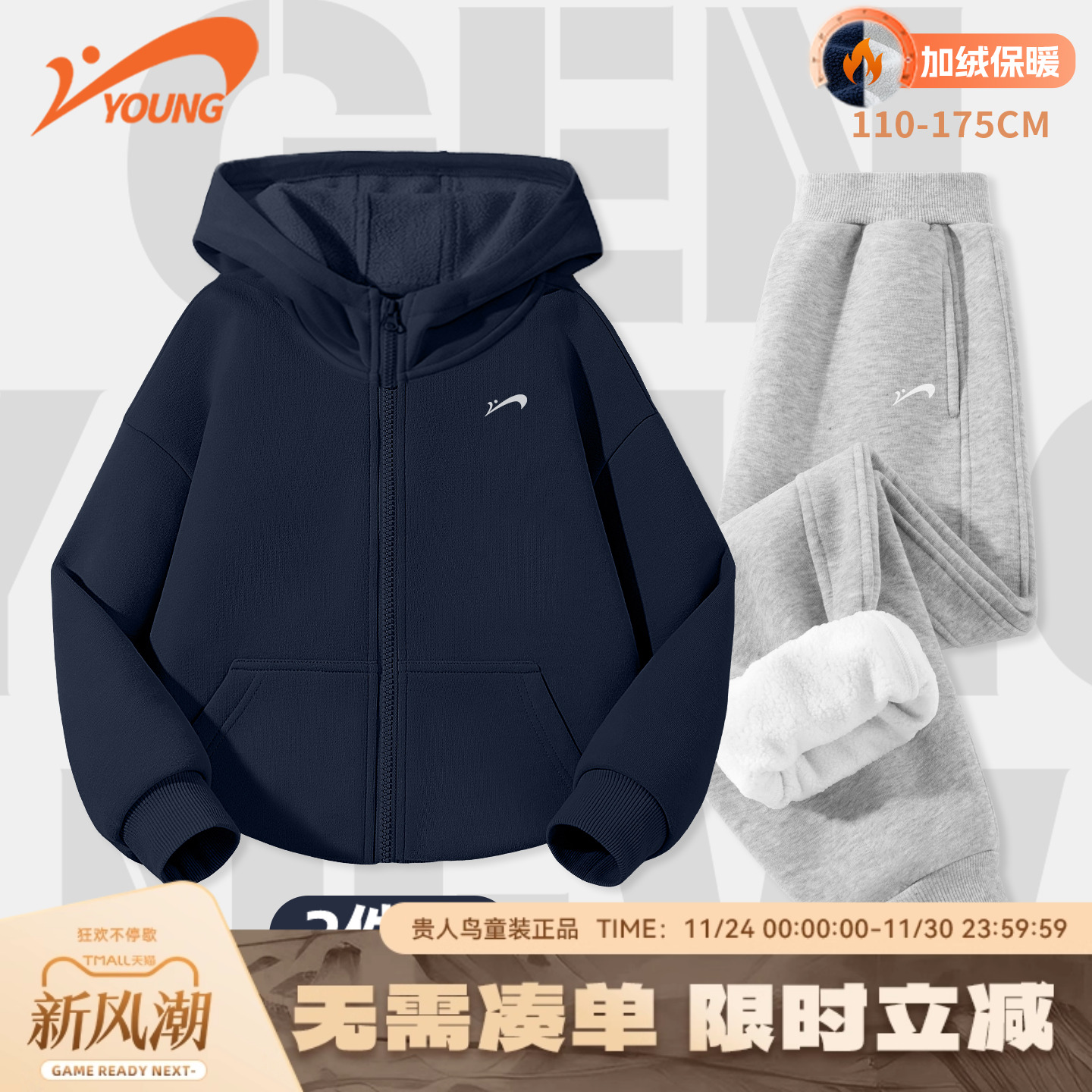 贵人鸟童装男童外套秋冬款儿童加绒加厚套装大童冬装女童运动衣服