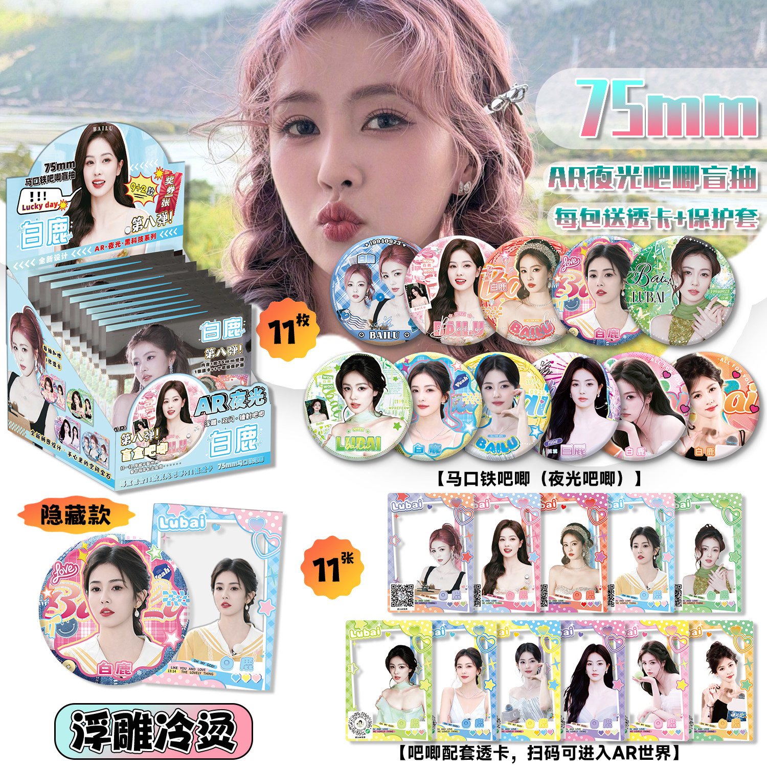 白鹿吧唧徽章盲盒透卡明星周边马口铁谷子75mm胸针夜光吧唧礼物