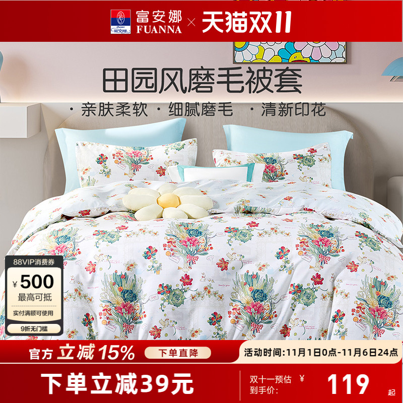 富安娜60支纯棉磨毛床上用品全棉床单被套简约双人床长绒棉四件套