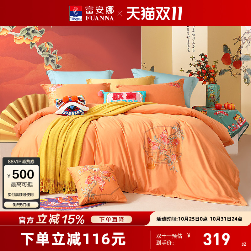 富安娜家纺60支磨毛床上用品全棉床单被套简约双人床长绒棉四件套