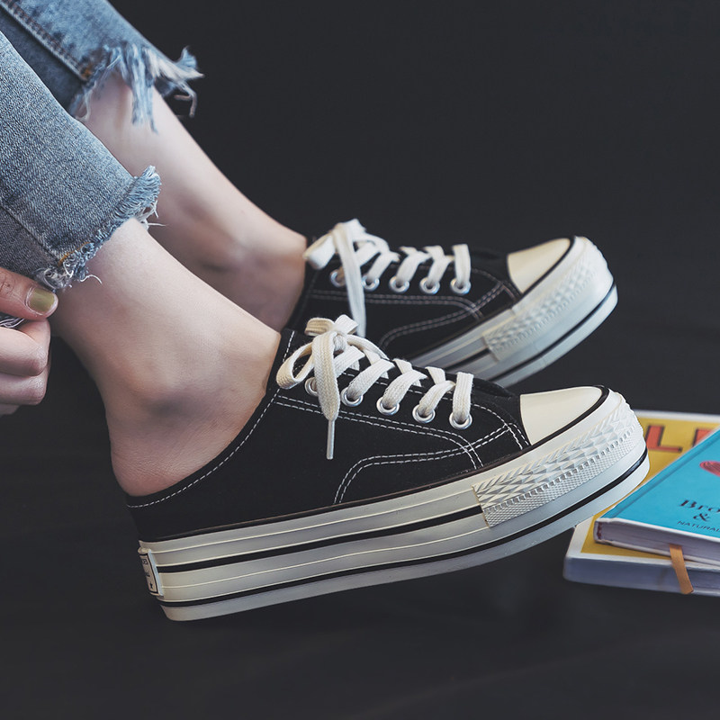 内增高半拖鞋2021夏秋季无后跟帆布鞋女学生韩版百搭透气厚底布鞋
