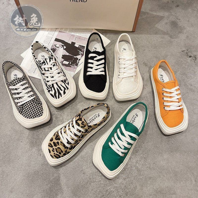 丑萌帆布鞋女学生韩版芒果头2023年新款豹纹平底百搭休闲鞋小白鞋