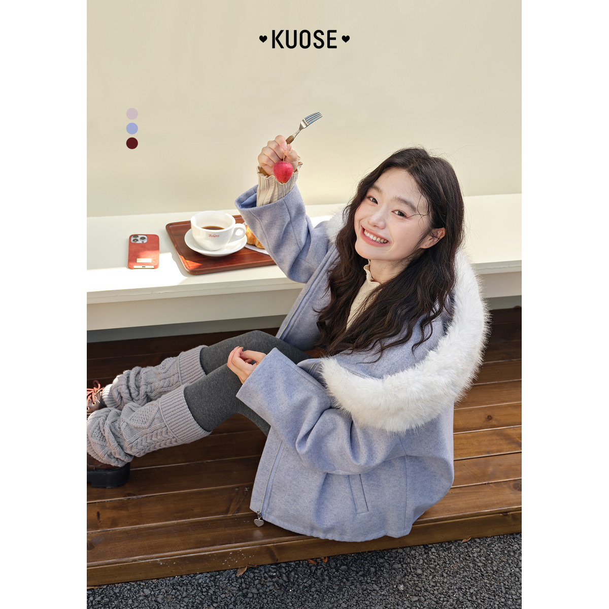 阔色灰紫色连帽毛领呢子大衣女2025秋冬新款慵懒红色毛呢外套短款