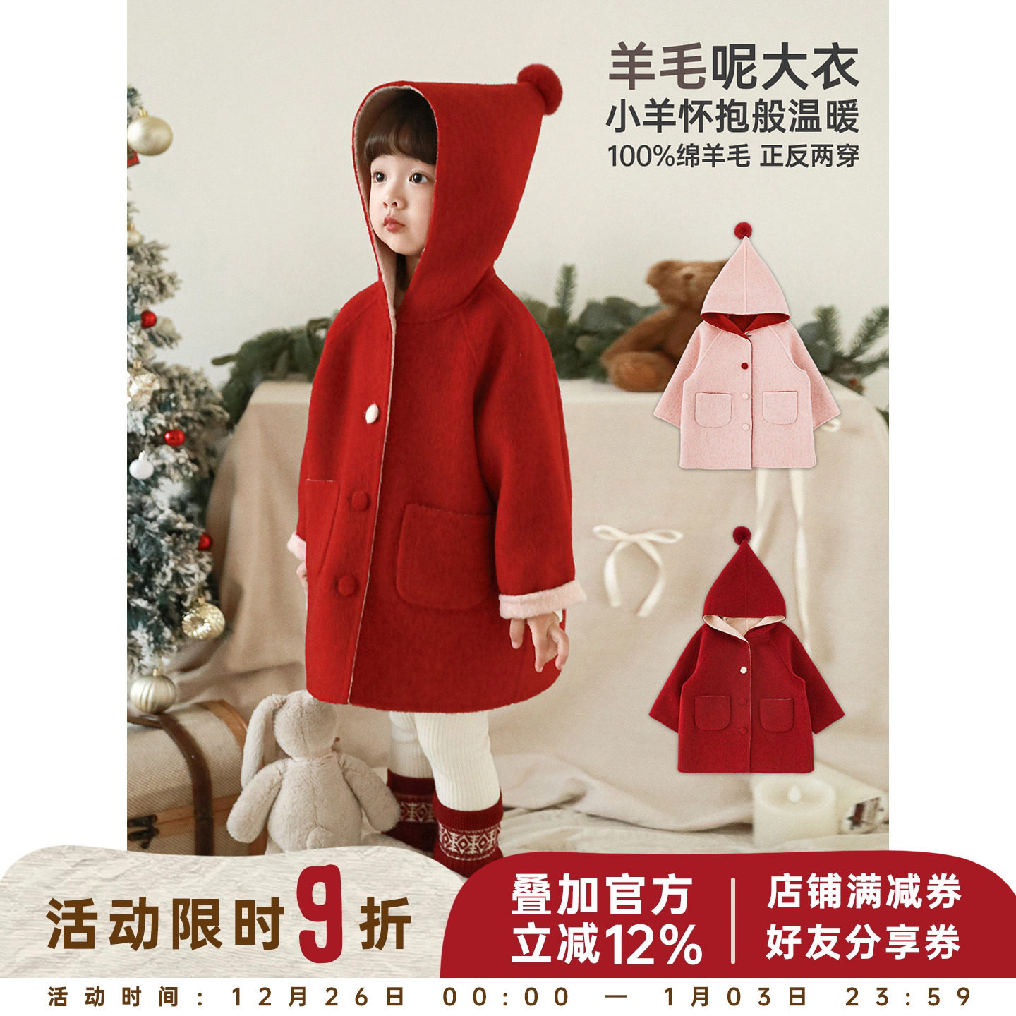幼悠女童2025冬季新款正反两穿羊毛呢大衣连帽保暖外套女孩拜年服