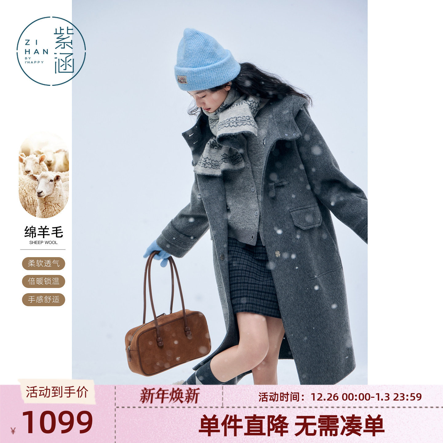 紫涵长款羊毛双面呢大衣女2025冬季新款气质简约保暖连帽毛呢外套