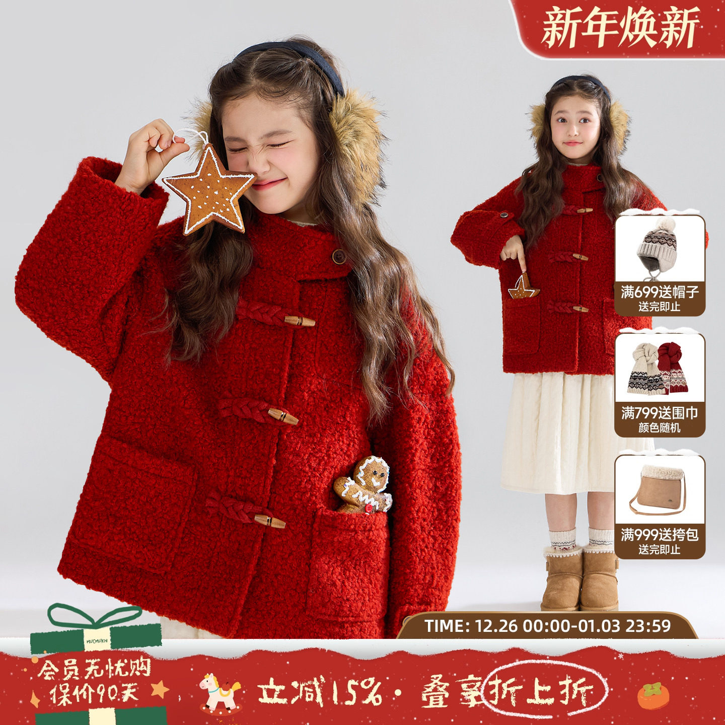 MUCMUKN【新年序曲】圈圈羊毛呢牛角扣连帽大衣保暖外套女童冬新