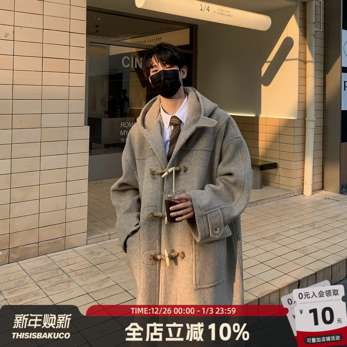 马登工装美式复古牛角扣连帽毛呢大衣学院风宽松长款外套男女秋冬