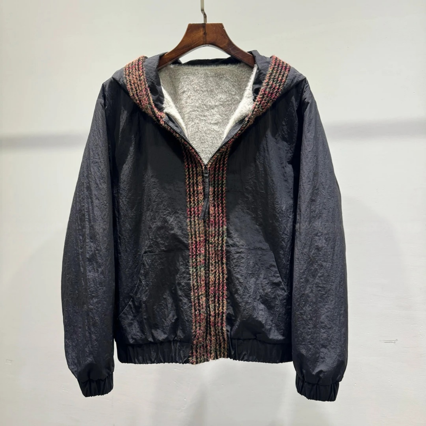 冬季撞色条纹拼接设计款轻奢风连帽加绒夹克男士保暖百搭休闲外套