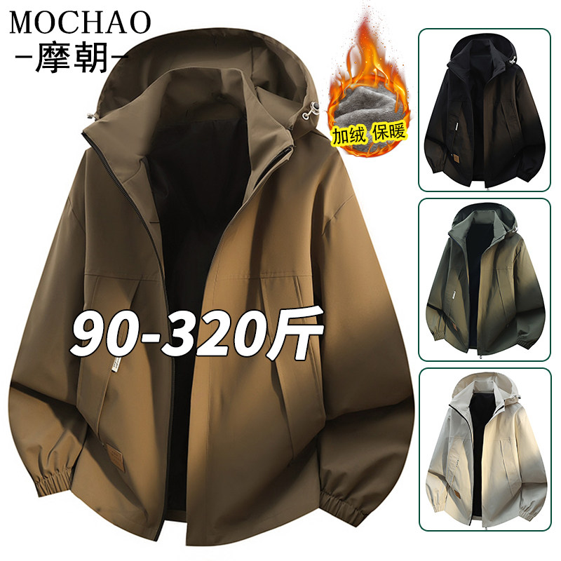 摩朝工装连帽夹克男士秋冬款加绒保暖宽松大码男装休闲冲锋衣外套