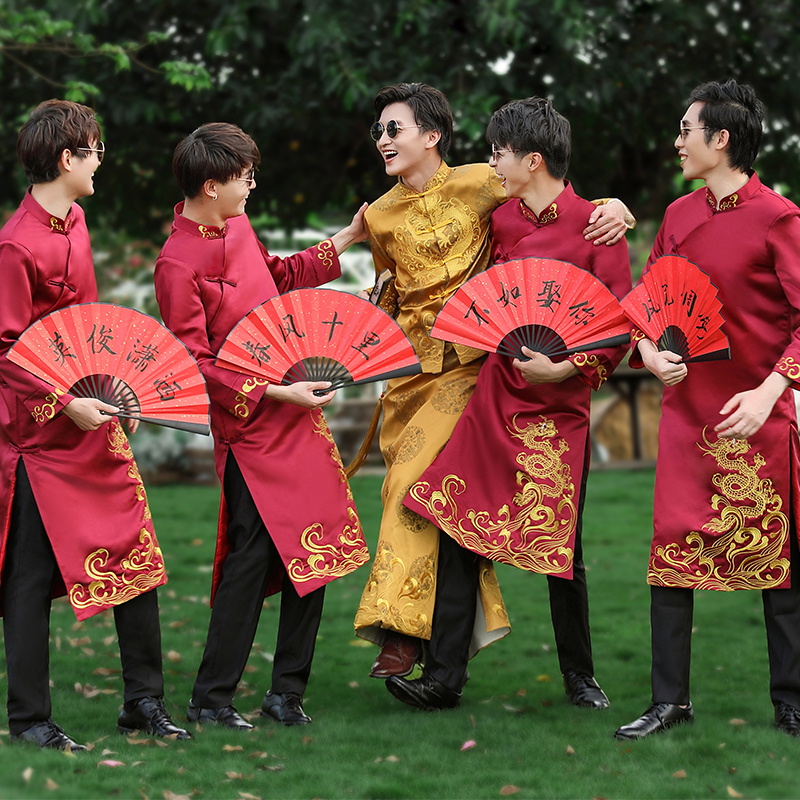 伴郎服中式男兄弟装结婚礼服新郎搞笑中国风汉服唐装大褂兄弟团服