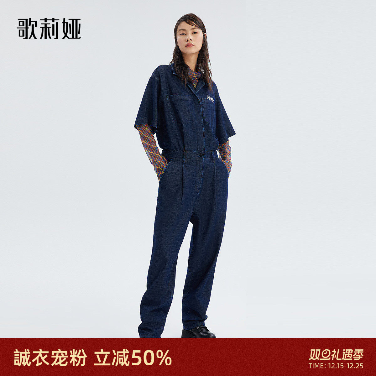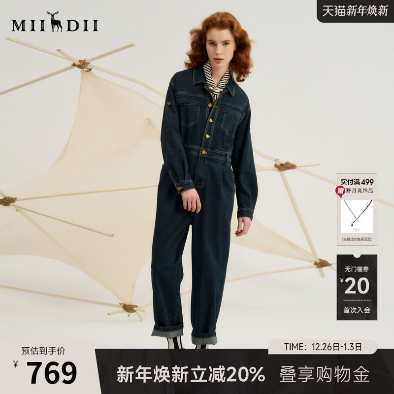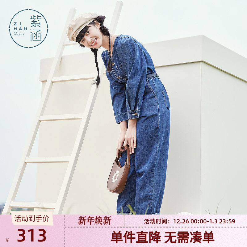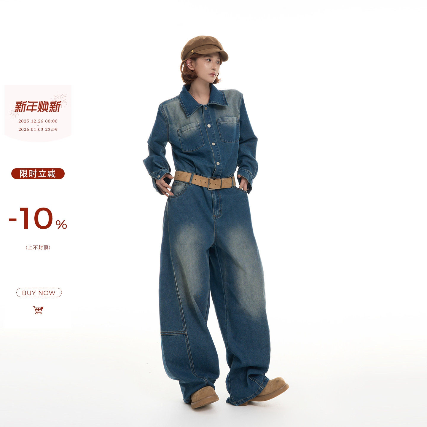谜底牛仔连体裤女秋季新品复古风时髦宽松直筒长裤243MK1113