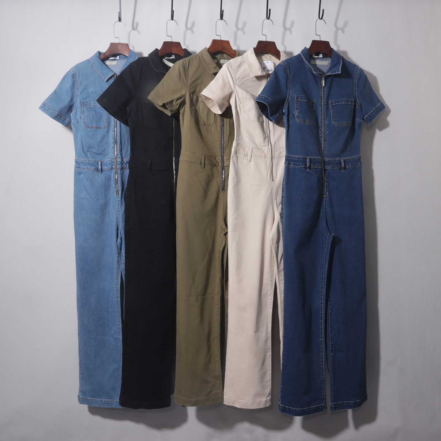 外贸翻领做旧复古长袖连体衣 春秋新款女假两件牛仔连体长裤14294