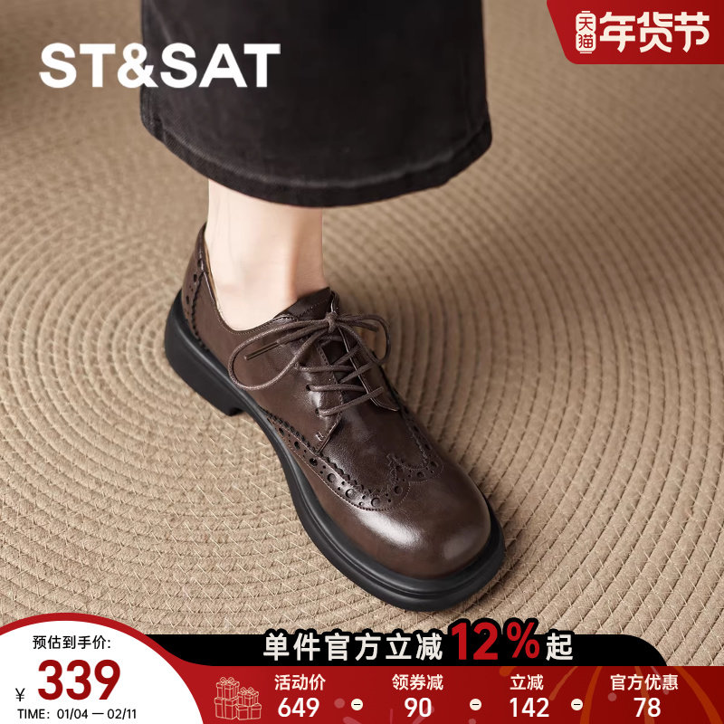星期六复古系带乐福鞋女2025新款秋冬老钱风布洛克单鞋棕色小皮鞋