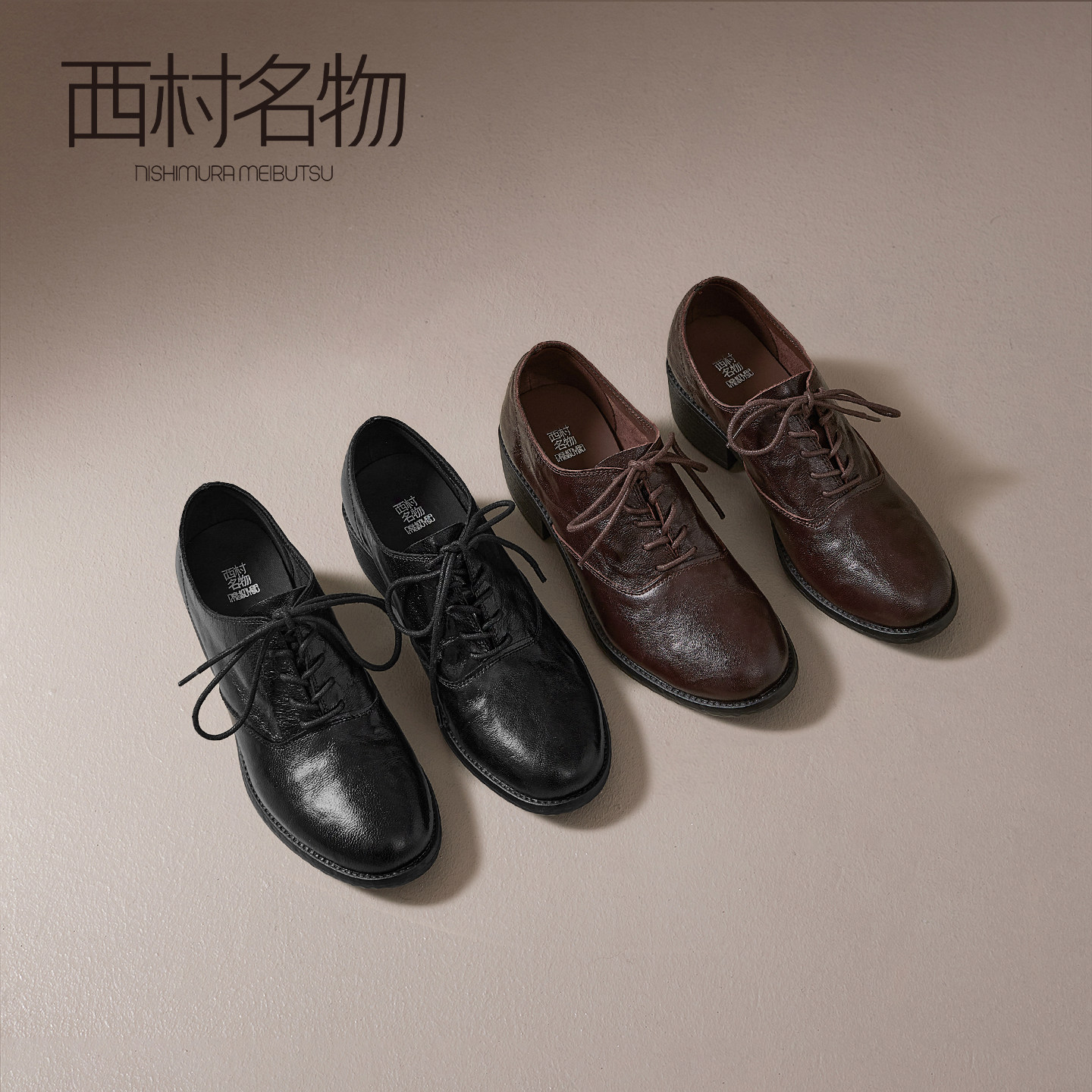 西村名物复古系带小皮鞋女2026春季新款粗跟圆头布洛克鞋中跟单鞋
