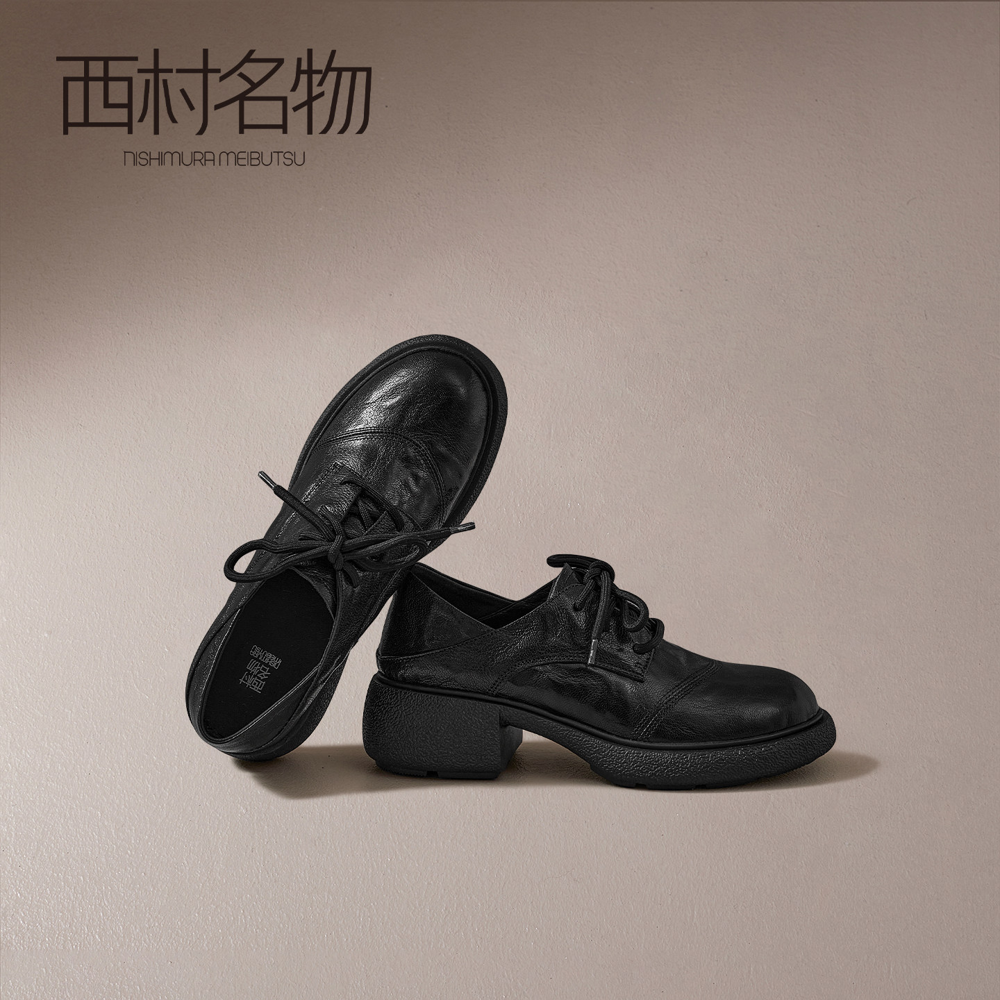 西村名物乐福鞋女2026春季新款布洛克黑色小皮鞋粗跟系带深口单鞋