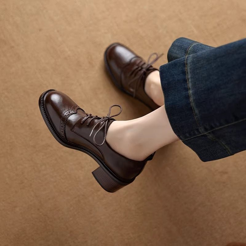 雕花布洛克英伦风小皮鞋女2025秋冬新款圆头系带显瘦增高休闲单鞋