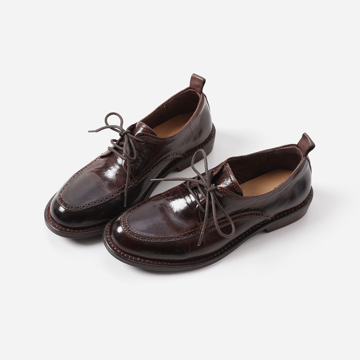 ED08049 茉莉雅集 复古水洗马皮系带深口单鞋布洛克小皮鞋乐福鞋