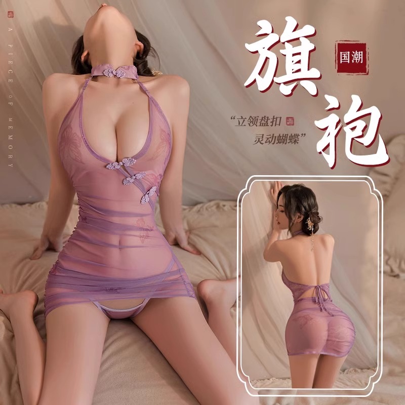 内衣女夏2025新款旗袍紫色国潮诱惑性感睡衣制服小胸免脱激情内衣