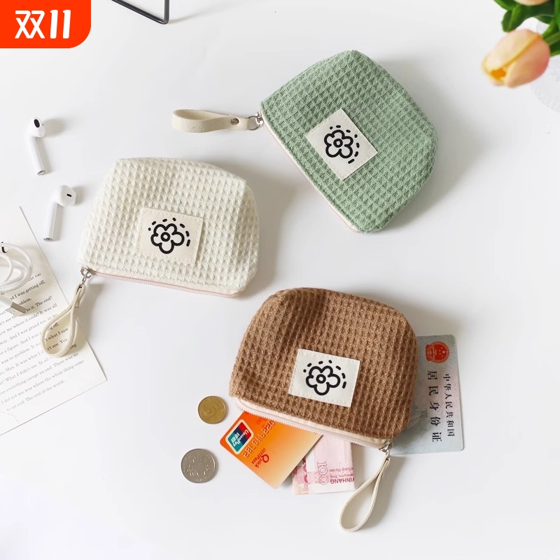 日系可爱简约华夫格零钱包女小巧便携小清新手腕包夏天花朵新款包