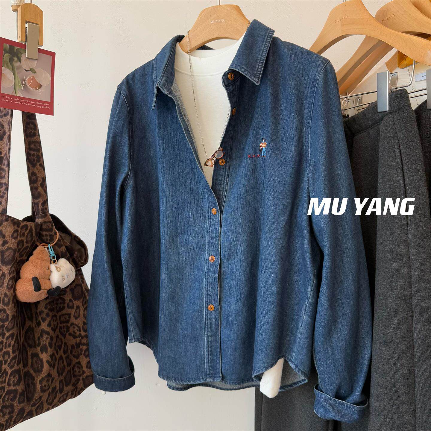 韩国25秋冬新 卡通小人刺绣 磨毛抓绒水洗柔软翻领内搭牛仔衬衫女