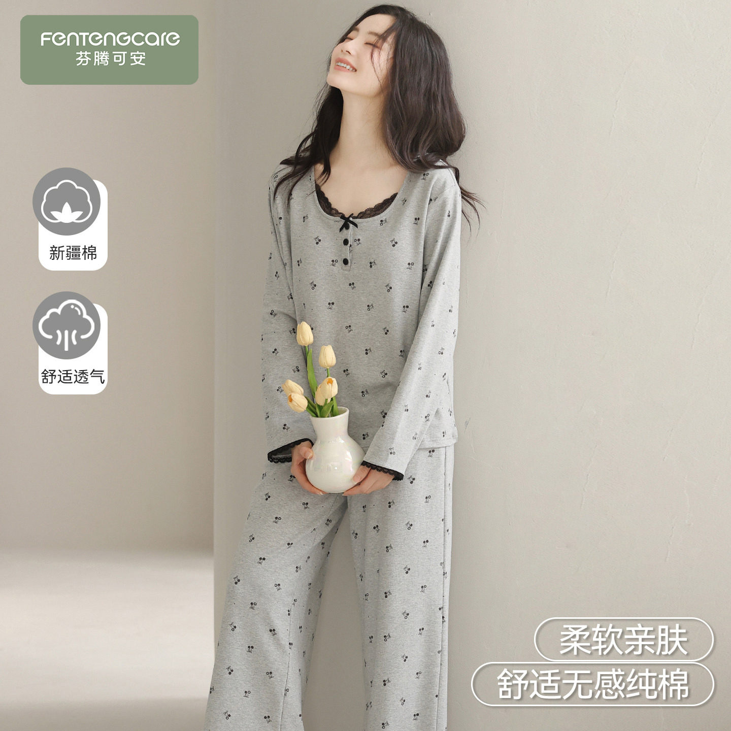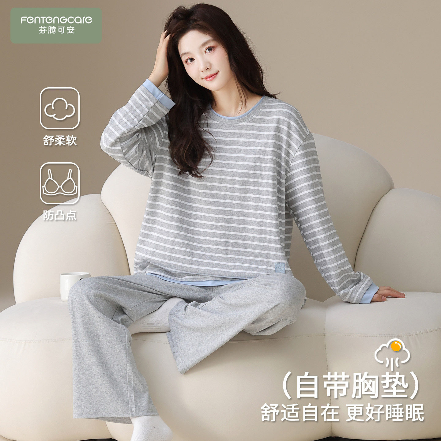 芬腾可安睡衣女款冬季高级感纯棉带胸垫女士长袖浅灰家居服春秋款
