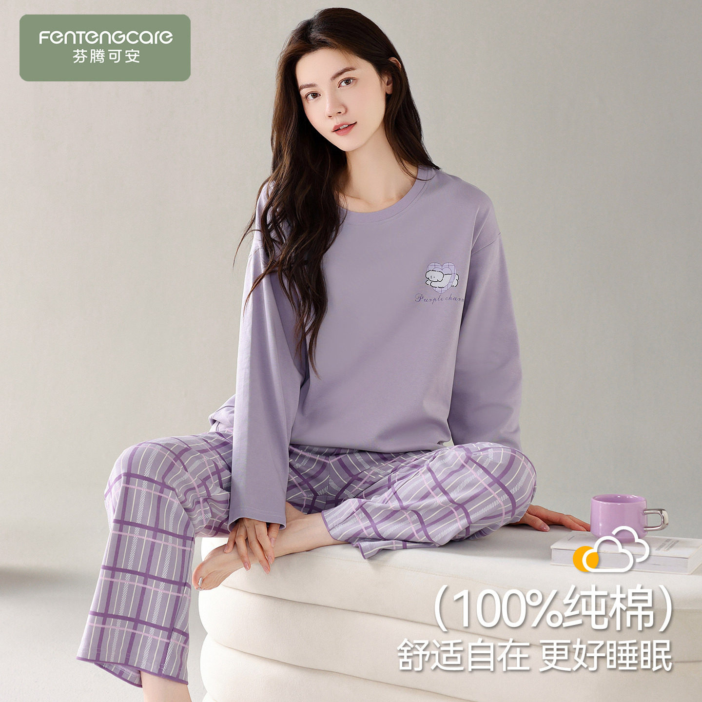 芬腾可安睡衣女款冬季纯棉布料100全棉女士长袖浅紫家居服春秋天