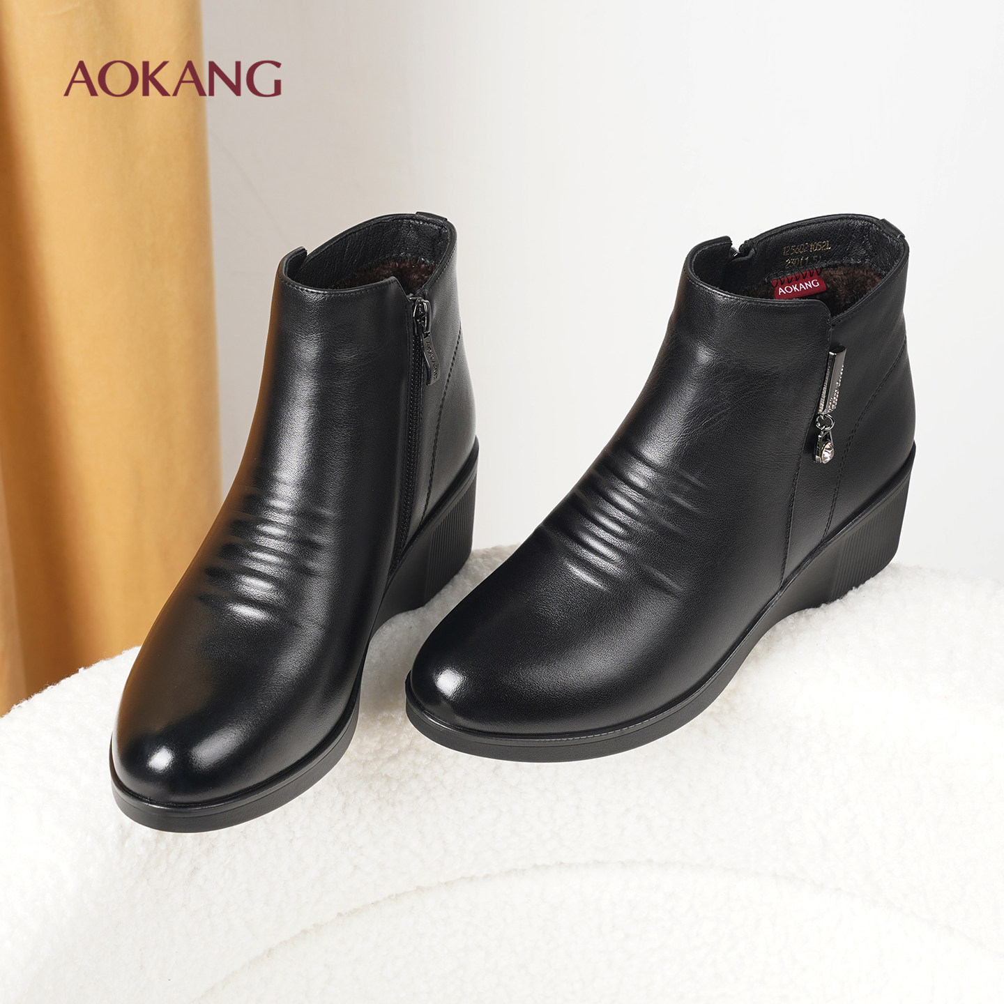 奥康 女靴冬季加绒坡跟保暖真皮中老年妈妈皮棉鞋休闲时装短靴L