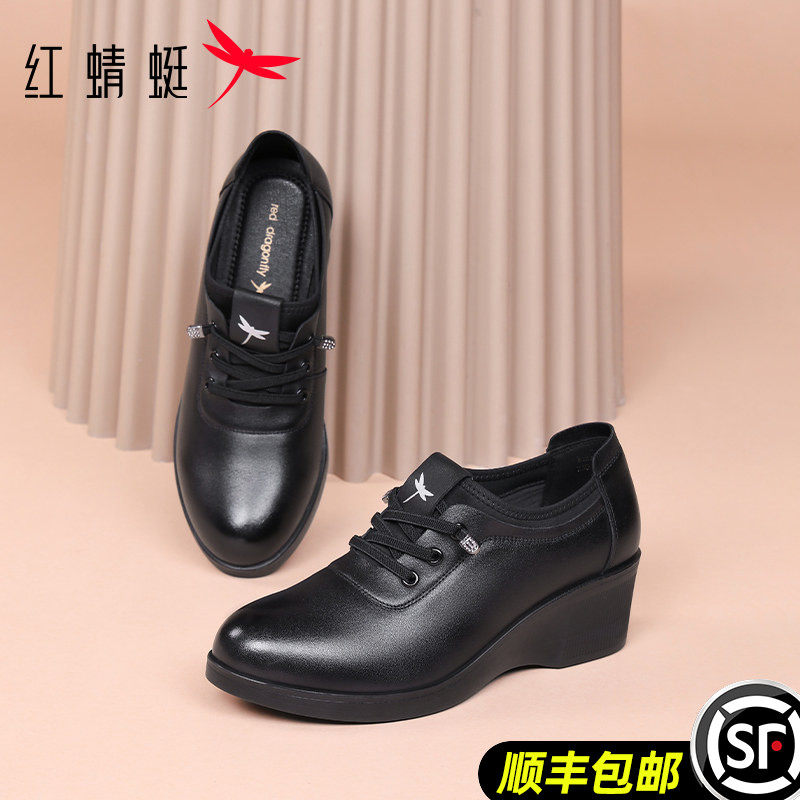 红蜻蜓女鞋春秋新款厚底高跟坡跟女士休闲皮鞋女单鞋真皮妈妈牛皮