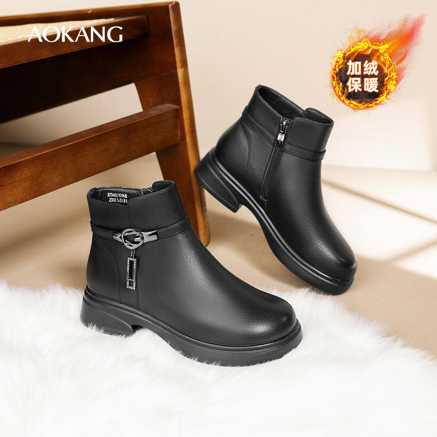 奥康女靴冬季真皮鞋坡跟保暖棉鞋加绒平底短靴舒适冬款妈妈靴皮靴