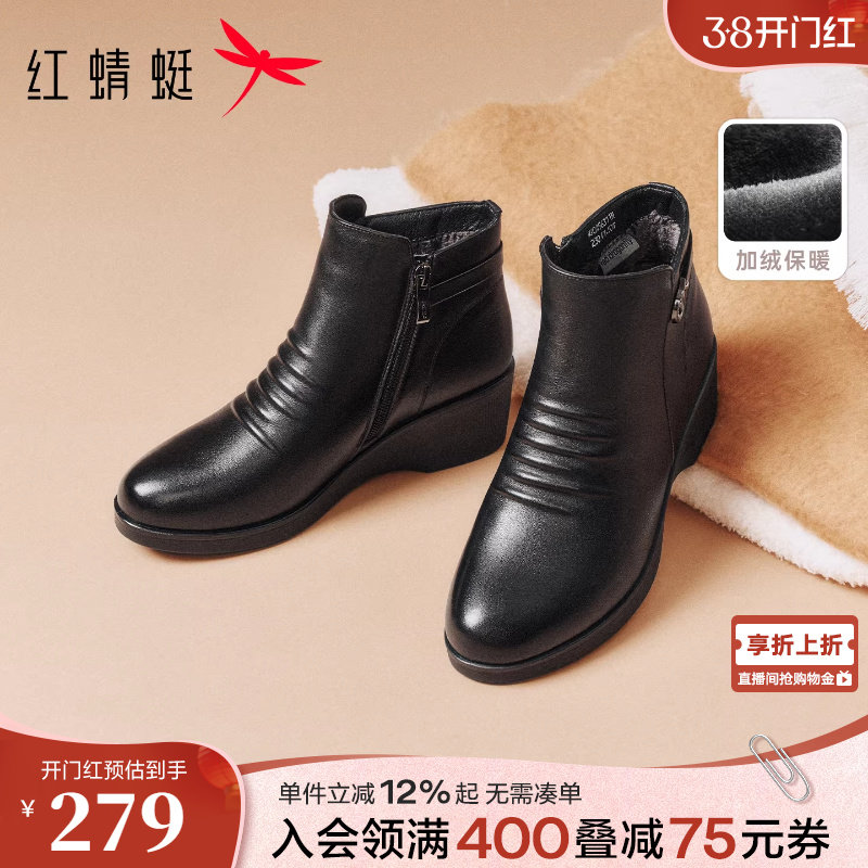 红蜻蜓冬季女鞋坡跟厚底靴子女短靴真皮加绒保暖妈妈皮靴棉鞋加厚