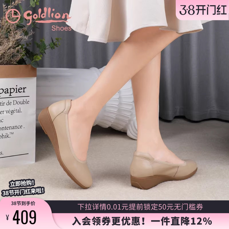 金利来舒适坡跟女鞋真皮圆头休闲通勤工作皮鞋浅口一脚蹬妈妈单鞋