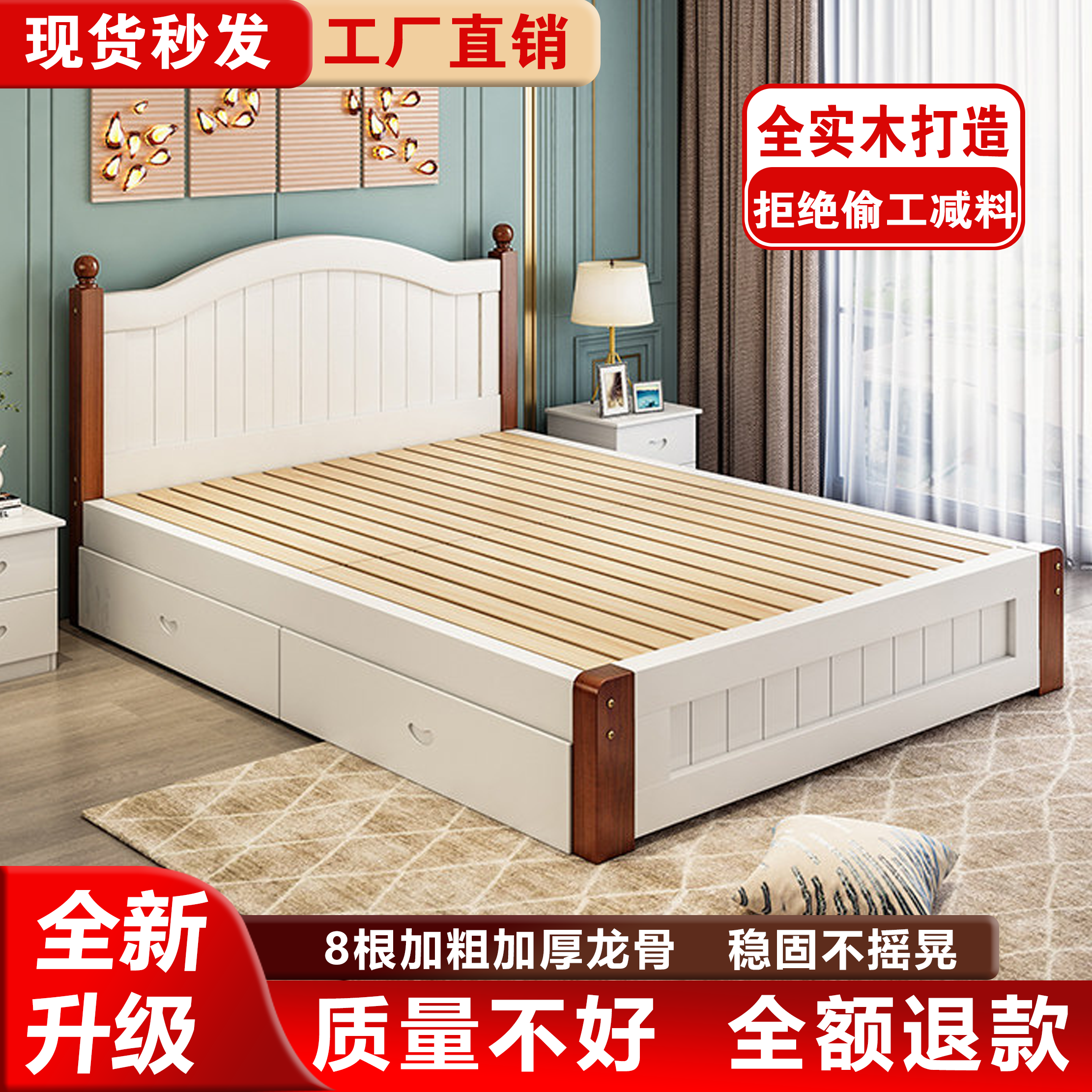 实木床现代简约白色储物1.8米双人床1.5单人床经济型全实木小户型