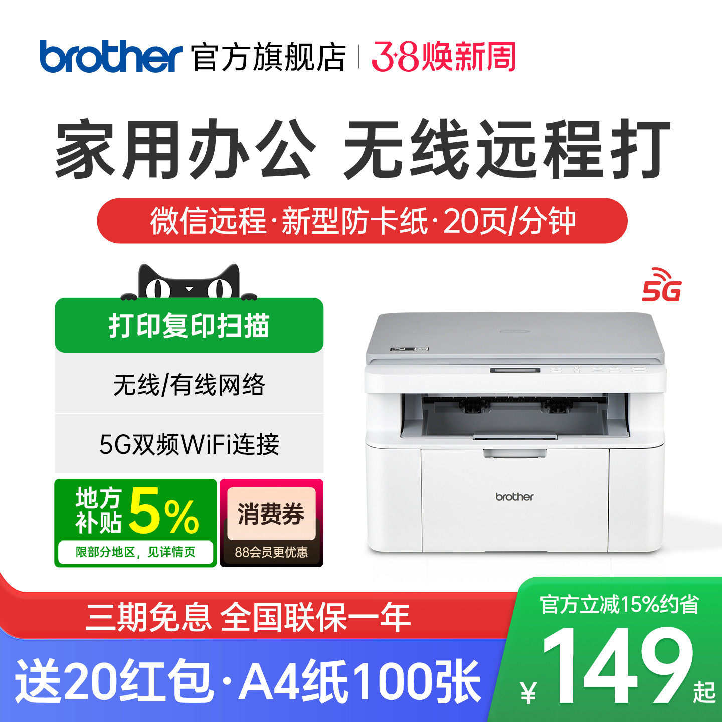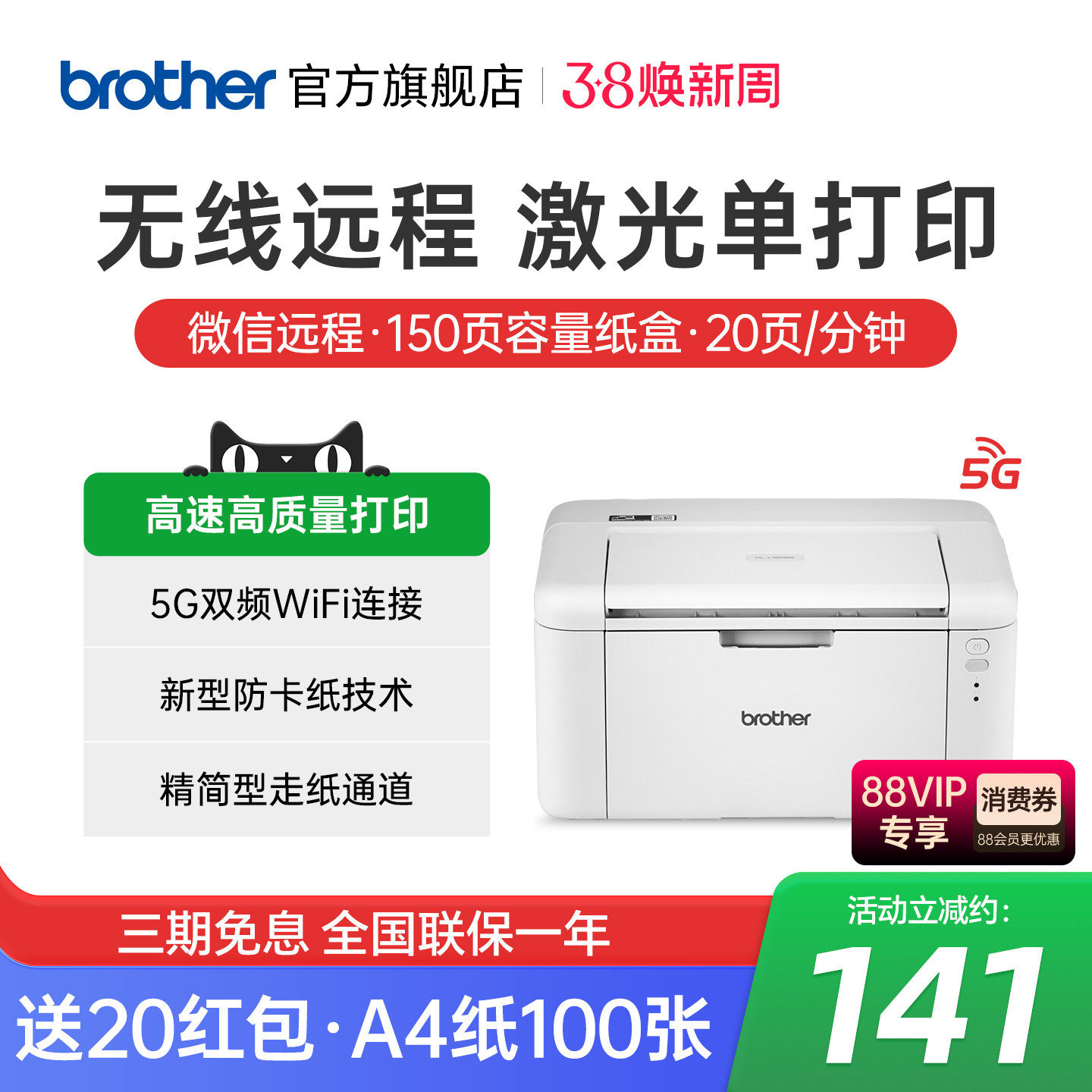 brother兄弟旗舰店HL-L1808W黑白激光打印机无线wifi手机家用家庭小型A4学生作业办公L1228