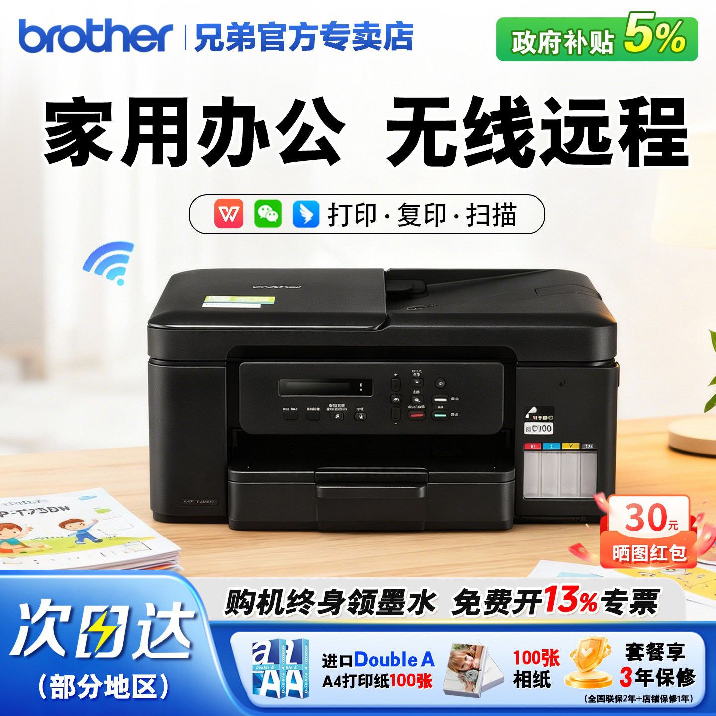 政府补贴兄弟DCP-T436W/735DW彩色办公喷墨打印复印扫描一体机