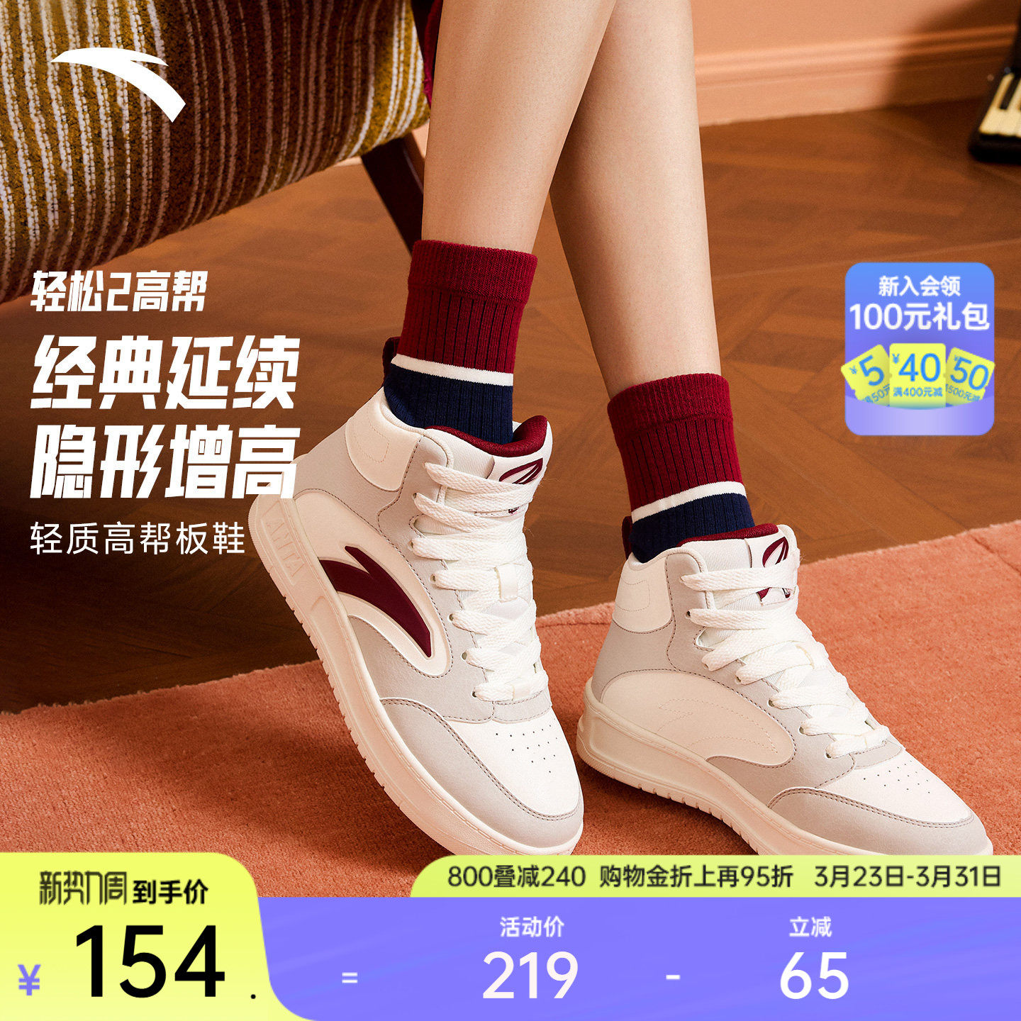 安踏轻松2丨经典撞色高帮板鞋女鞋2025冬季新款滑板鞋潮流运动鞋