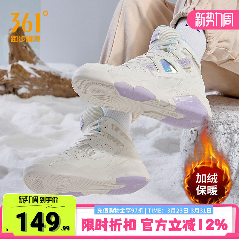 361度女鞋高帮运动鞋冬季加绒革面防水板鞋厚底增高休闲鞋小白鞋
