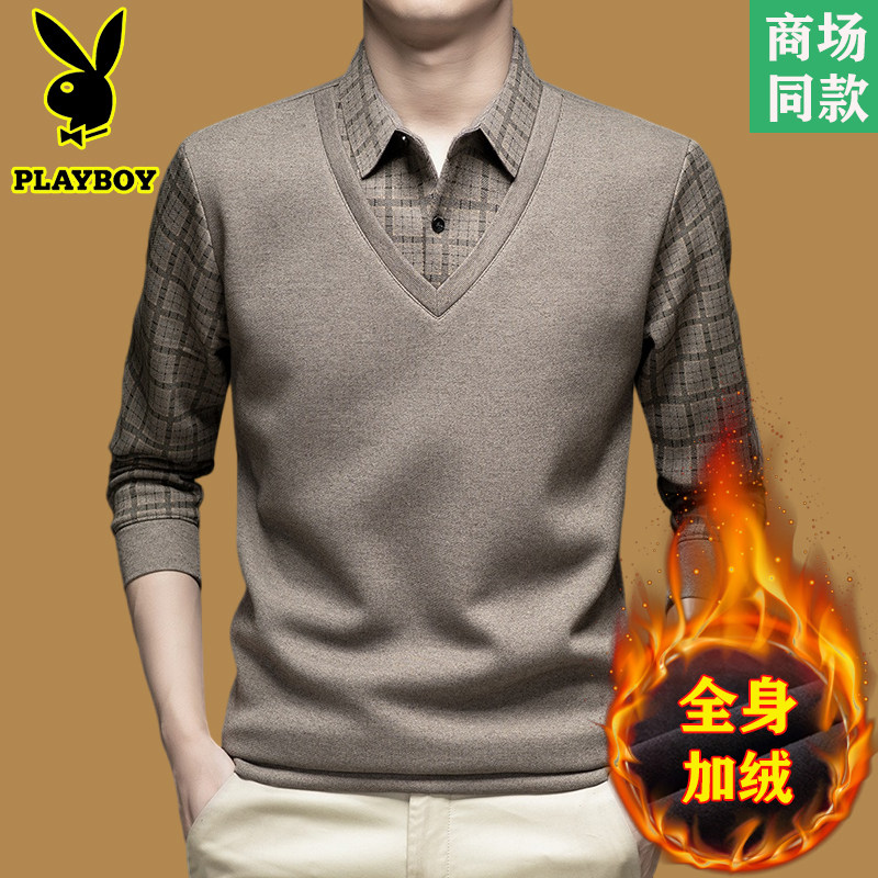 花花公子假两件加绒毛衣男士秋冬新款加厚衬衫领针织打底衫男装潮