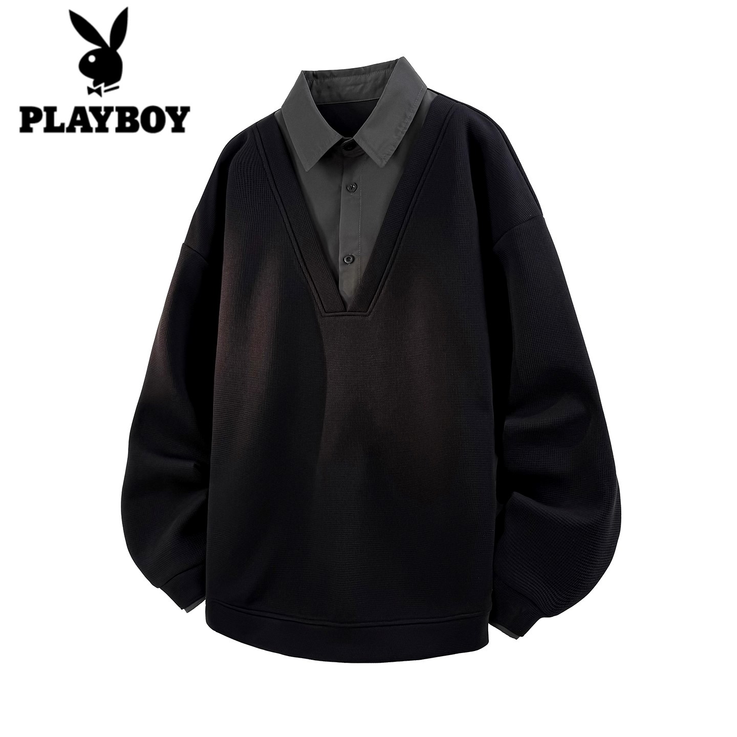 花花公子华夫格日系卫衣男士秋冬新款假两件衬衫领高级感潮流上衣