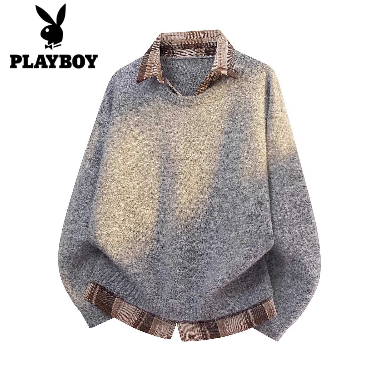 花花公子绵羊毛针织衫假两件男女同款秋季格纹衬衫领休闲卫衣新款