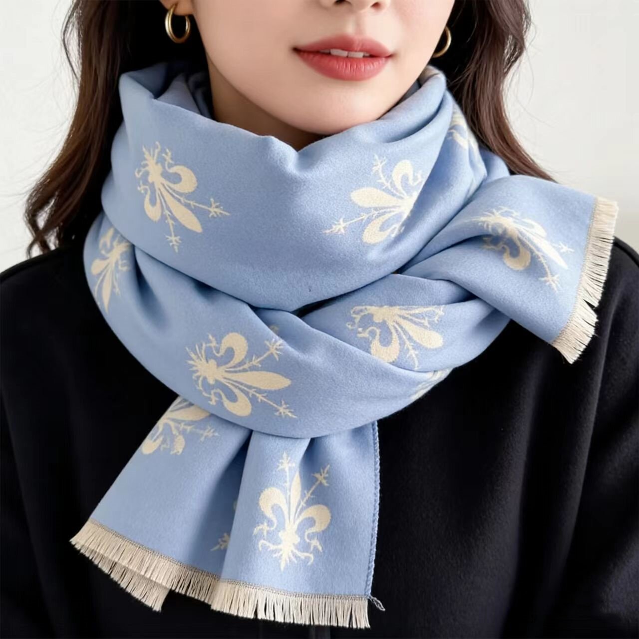 法国羊绒围巾女2026春夏中国风鸢尾花双面长方形浅蓝色披肩高级感