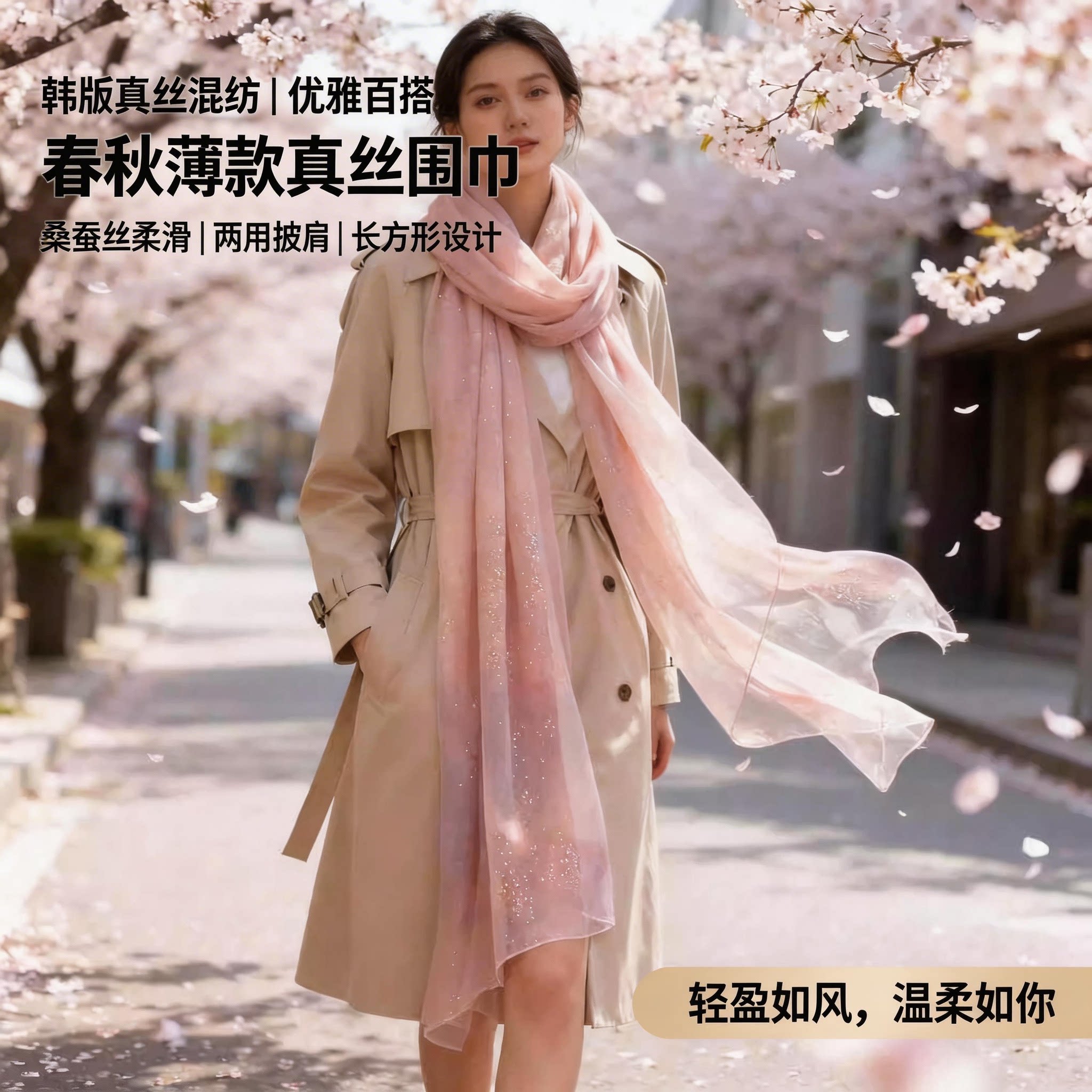 韩版真丝混纺围巾女春秋百搭薄款桑蚕丝披肩两用长方形长款浅粉色
