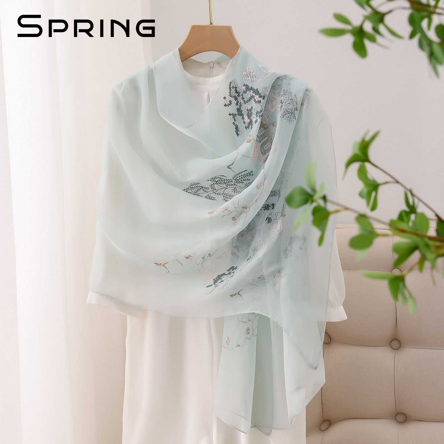中国风真苏州丝刺绣丝巾女春夏季薄款长方形植物花卉披肩围巾送礼