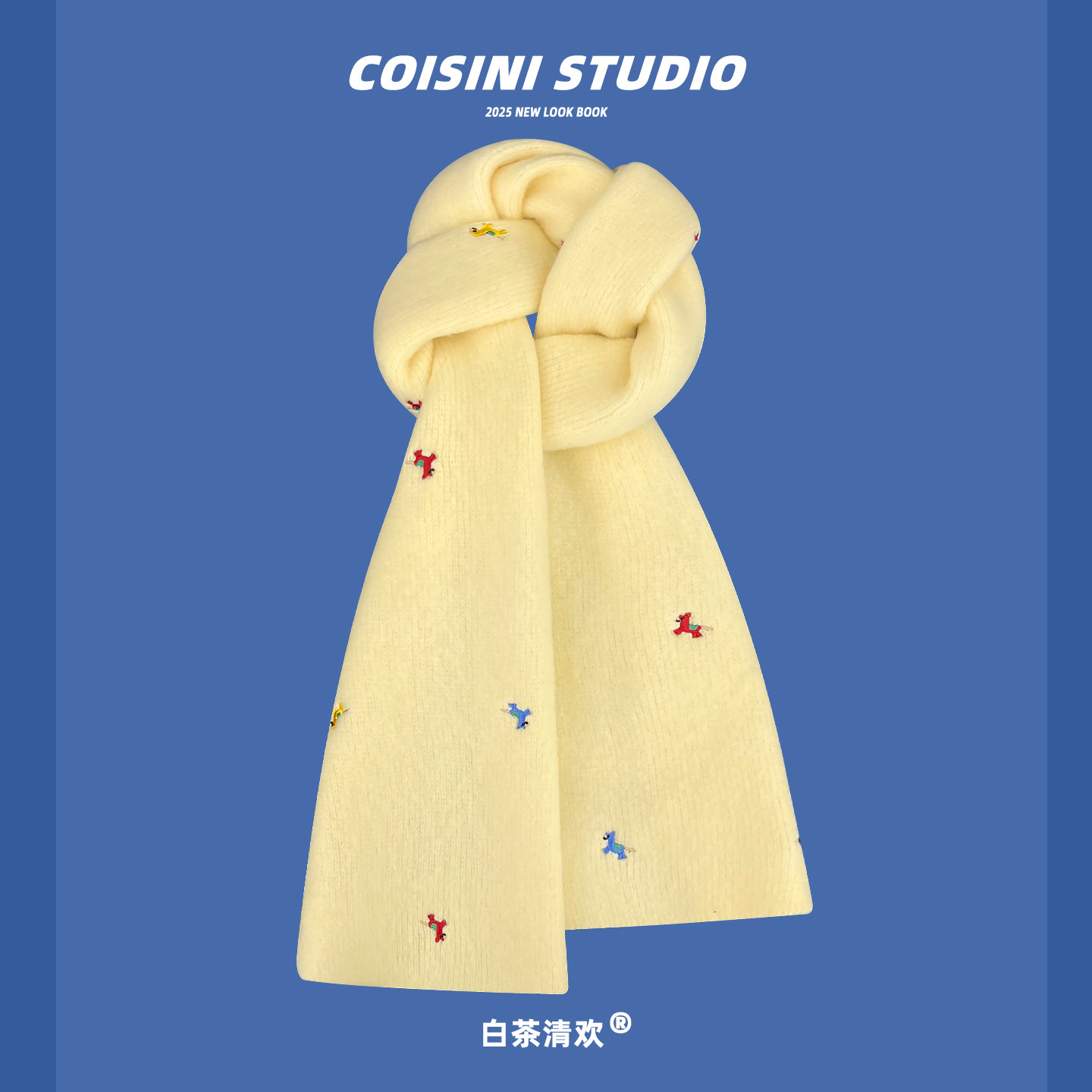 多巴胺韩版小马刺绣针织围巾男女通用冬季保暖长方形情侣披肩围脖