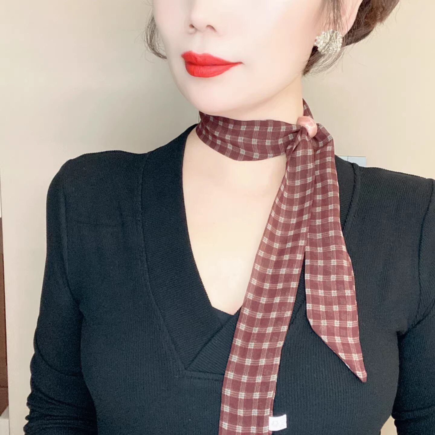 韩版格子窄款丝巾女春夏秋高级感长方形围巾百搭飘带护颈装饰头巾