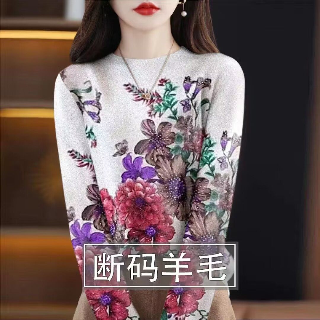 羊毛衫女士套头短款圆领毛衣春秋薄款时尚洋气羊毛印花打底衫外穿