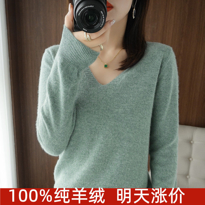 秋冬V领羊绒衫女100纯山羊绒套头短款打底长袖百搭针织打底薄毛衣