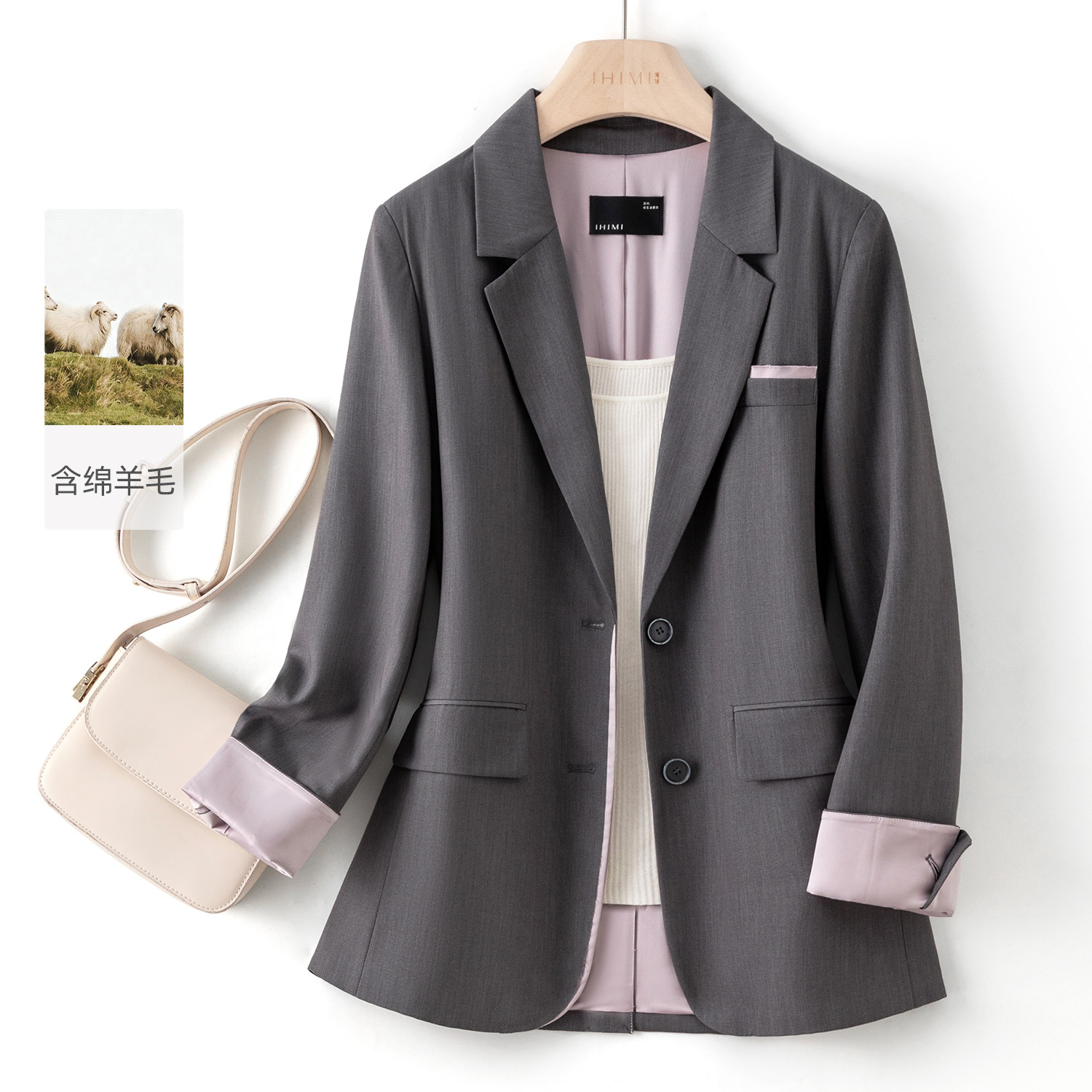 IHIMI海谧含羊毛撞色西装外套女款春季都市职场通勤宽松显瘦上衣